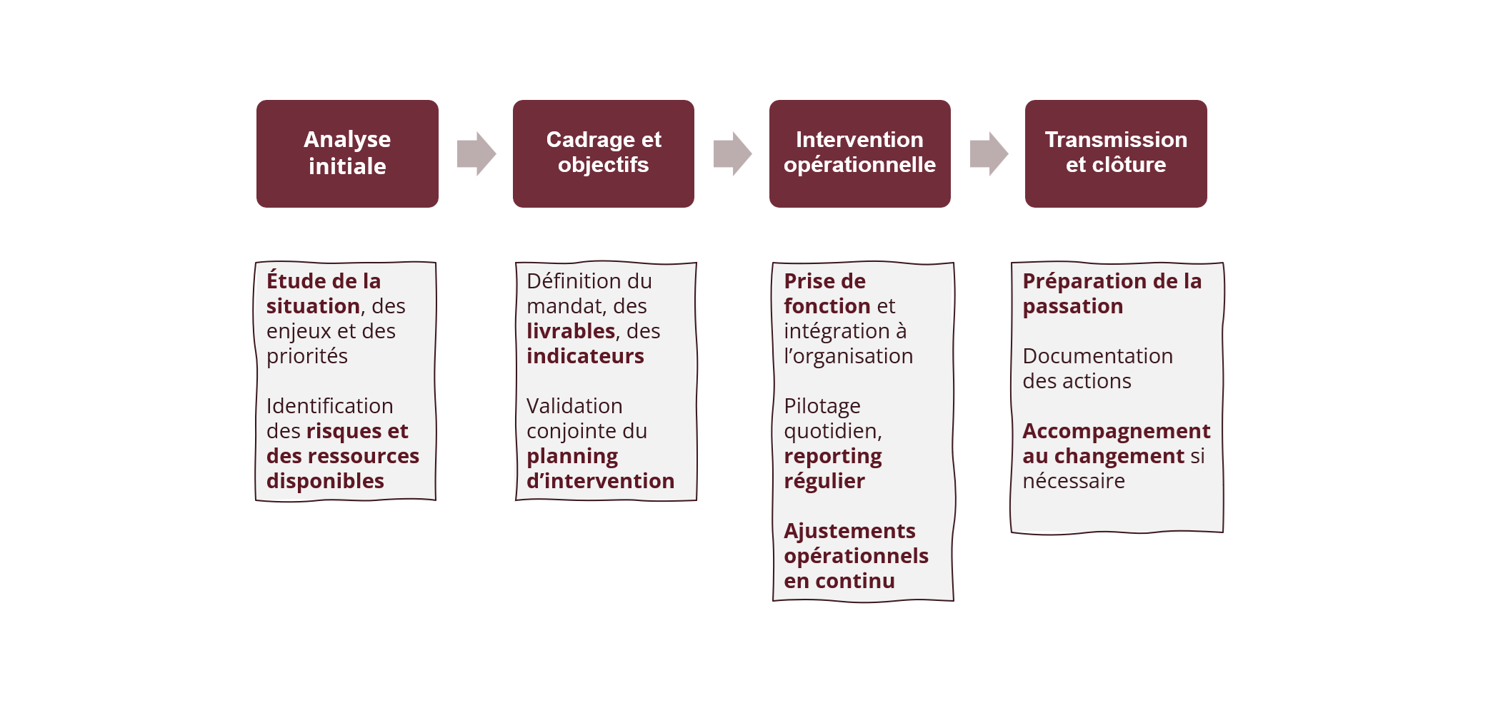 Pour préparer le terrain avant l’arrivée d’une nouvelle direction : clarifier les enjeux, stabiliser l’organisation, structurer les équipes, déployer les premières orientations.